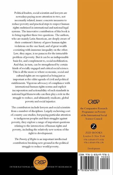 Political leaders, social scientists and lawyers are nowadays paying more attention to two, not necessarily related, issues: concrete measures to reduce poverty and practical steps to respect human rights enshrined in international and national legal systems. The innovative contribution of this volume is its bringing together of these two questions. The authors, who are mainly Latin American, are deeply aware of their own continent's particular history vis-a-vis grave human rights violations on the one hand, and the coexistence of great wealth alongside immense inequality on the other. Law, they argue, is no panacea for the intractable problem of poverty. But it can be an indispensable basis for, and complement to, social mobilization, which, in turn, can be strengthened by certain kinds of socially engaged and critical social science. This is all the more so where economic, social and cultural rights are recognized as being just as important as the older agenda of civil and political entitlements. Vigorous advocacy of compliance with international human rights norms and explicit incorporation and actionability of such standards in national legal frameworks can then play a role in the struggle to reduce, and ultimately eradicate, global poverty and social injustice. The contributors include lawyers and social scientists from a number of disciplines. Largely eschewing a set of country case studies, but paying particular attention to indigenous peoples and their struggles against poverty, they explore a range of important questions relating to the intersection of human rights and poverty, including the relatively new notion of the right to development. An important intellectual contribution breaking new ground in the political struggle to reduce world poverty.