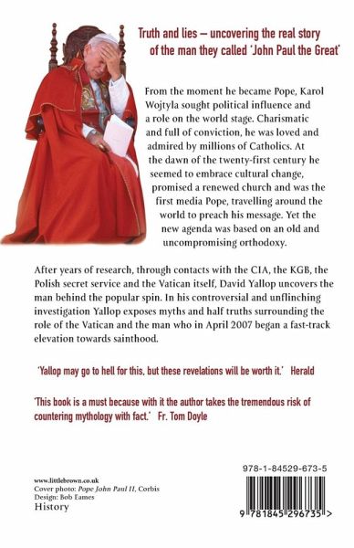 John Paul II and the dark heart of the Catholic Church...In 1984 David Yallops In Gods Name changed the way that the world looked at the Vatican. In The Power and The Glory David Yallop returns to Rome with another explosive story: the true history of the papacy of John Paul II. From the first moment of his papacy, Karol Wojtyla sought political influence and a role on the world stage. At the dawn of the twenty-first century, he was a leader to millions of Catholics at a time of tremendous change. Promising a renewed church, he was the first media Pope and travelled around the world to preach his message. It is said that he was central in the fall of Soviet Eastern Europe, in particular within his own homeland of Poland. But has the real truth of this Papacy been revealed? The Power & the Glory explores the continued financial scandal involving theVatican bank, the mafia, Freemasonry, illegal money laundering and arms sales. Exposes the true extent of the Pope's failure to control the child abuse scandal. Contains explosive revelations from the CIA, the KGB, the Polish secret service and the most secretive place on earth, the Vatican itself. Tells for the first time John Paul II's real involvement in the fall of the Iron Curtain and the liberation of Poland. Uncovers the myth of the Holy Alliance between Reagan's America and the Vatican.