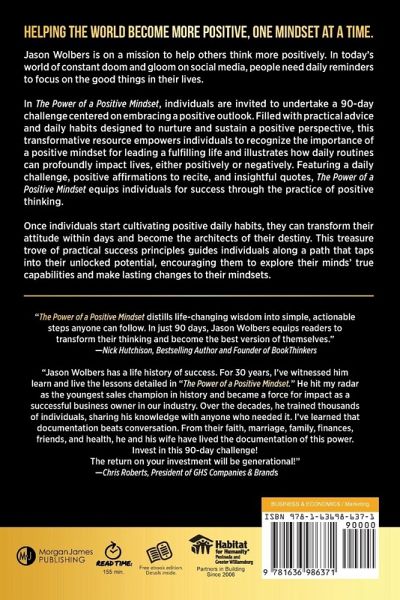 Helping the world become more positive, one mindset at a time.Jason Wolbers, a seasoned salesperson and successful business owner, is on a mission to help others think more positively. In today's world of constant doom and gloom on social media, people need daily reminders to focus on the good things in their life. In The Power of a Positive Mindset, individuals are invited to complete a 90-day challenge to embrace a positive mindset. Filled with practical advice and daily habits to develop and maintain a positive mindset, this transformative resource helps individuals understand why a positive outlook is vital for a happy life and how daily routines can shape lives, for good or for bad. Featuring a daily challenge, positive affirmations to recite, and insightful quotes, The Power of a Positive Mindset sets individuals up for success through positive thinking.Once individuals begin cultivating positive daily habits, they can shift their attitude within days and become the architect of their destiny. This treasure trove of practical success principles takes individuals down a path that taps into unlocked potential, urging them to explore the true capabilities of their mind and make lasting changes to their mindset.One truly becomes what one thinks about-so let’s make it something positive!