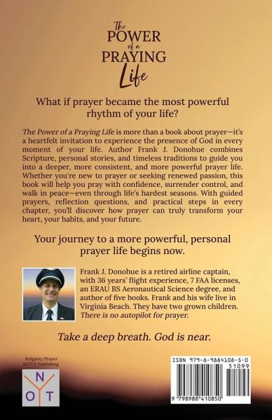 In The Power of a Praying Life, Frank J. Donohue invites readers into a transformative journey where prayer becomes not just a practice, but a way of life. This inspiring guide blends Scripture, personal testimony, and timeless Christian traditions to show how authentic prayer can deepen your faith, renew your hope, and bring peace regardless of life's circumstances. Rather than offering a formulaic approach, Donohue encourages readers to cultivate a real and personal relationship with God-one marked by ongoing conversation, surrender, trust, and love. Each chapter is thoughtfully designed with:Guided prayers to help readers speak from the heart Reflection tools and prompts that encourage honest spiritual growth Scripture-based insights that reveal the richness and relevance of biblical prayer Real-life stories that offer encouragement and connection Whether you're just beginning your spiritual journey or are looking to go deeper, The Power of a Praying Life offers practical wisdom and gentle guidance to help you experience the presence of God in everyday moments. From seasons of joy to times of struggle, this book is a faithful companion to those who long to walk more closely with God and discover the peace that only He can provide. Perfect for individual devotion, group study, or as a gift to anyone seeking a deeper spiritual life, this book is an invitation to discover how powerful, healing, and life-giving prayer can truly be.