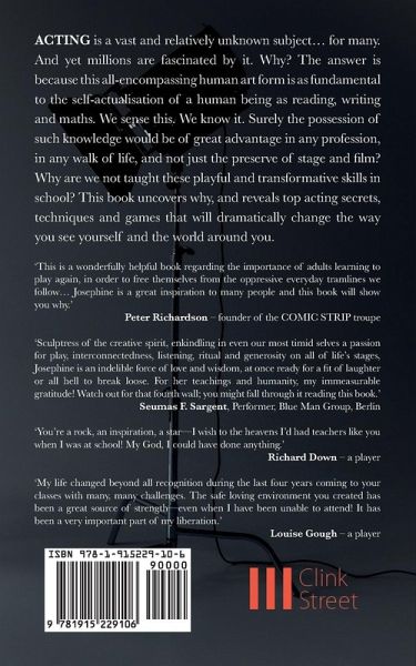 ACTING is a vast and relatively unknown subject... for many. And yet millions are fascinated by it. Why? The answer is because this all-encompassing human art form is as fundamental to the self-actualisation of a human being as reading, writing and maths. We sense this. We know it. Surely the possession of such knowledge would be of great advantage in any profession, in any walk of life, and not just the preserve of stage and film? Why are we not taught these playful and transformative skills in school? This book uncovers why, and reveals top acting secrets, techniques and games that will dramatically change the way you see yourself and the world around you. 'This is a wonderfully helpful book regarding the importance of adults learning to play again, in order to free themselves from the oppressive everyday tramlines we follow... Josephine is a great inspiration to many people and this book will show you why.' Peter Richardson - founder of the COMIC STRIP troupe 'Sculptress of the creative spirit, enkindling in even our most timid selves a passion for play, interconnectedness, listening, ritual and generosity on all of life's stages,Josephine is an indelible force of love and wisdom, at once ready for a fit of laughter or all hell to break loose. For her teachings and humanity, my immeasurable gratitude! Watch out for that fourth wall; you might fall through it reading this book.' Seumas F. Sargent, Performer, Blue Man Group, Berlin 'You're a rock, an inspiration, a star-I wish to the heavens I'd had teachers like you when I was at school! My God, I could have done anything.' Richard Down - a player 'My life changed beyond all recognition during the last four years coming to your classes with many, many challenges. The safe loving environment you created has been a great source of strength-even when I have been unable to attend! It has been a very important part of my liberation.' Louise Gough - a player