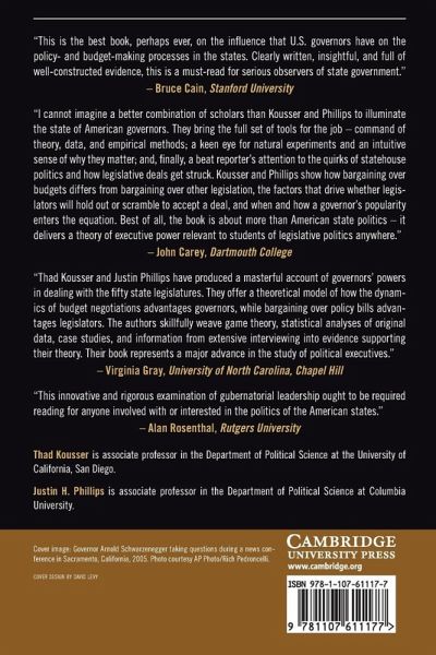 With limited authority over state lawmaking, but ultimate responsibility for the performance of government, how effective are governors in moving their programs through the legislature? This book advances a new theory about what makes chief executives most successful and explores this theory through original data. Thad Kousser and Justin H. Phillips argue that negotiations over the budget, on the one hand, and policy bills on the other are driven by fundamentally different dynamics. They capture these dynamics in models informed by interviews with gubernatorial advisors, cabinet members, press secretaries and governors themselves. Through a series of novel empirical analyses and rich case studies, the authors demonstrate that governors can be powerful actors in the lawmaking process, but that what they're bargaining over - the budget or policy - shapes both how they play the game and how often they can win it.