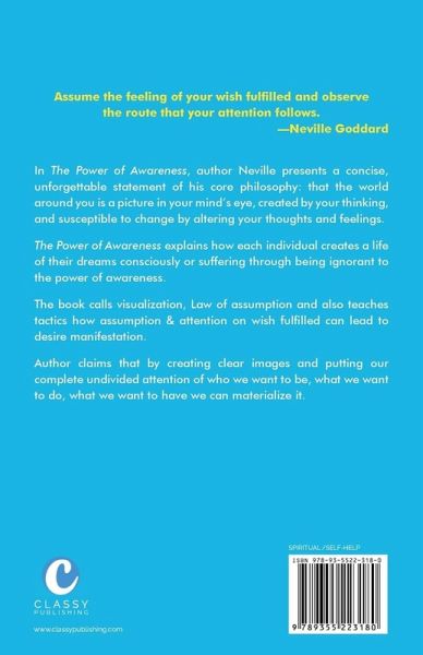 Assume the feeling of your wish fulfilled and observe the route that your attention follows.-Neville Goddard In The Power of Awareness, author Neville presents a concise, unforgettable statement of his core philosophy: that the world around you is a picture in your mind's eye, created by your thinking, and susceptible to change by altering your thoughts and feelings. The Power of Awareness explains how each individual creates a life of their dreams consciously or suffering through being ignorant to the power of awareness. The book calls visualization, Law of assumption and also teaches tactics how assumption & attention on wish fulfilled can lead to desire manifestation. Author claims that by creating clear images and putting our complete undivided attention of who we want to be, what we want to do, what we want to have we can materialize it.