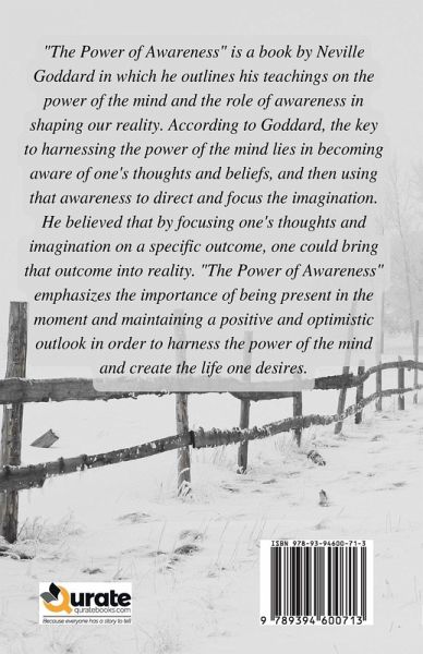 "The Power of Awareness" is a book by Neville Goddard in which he outlines his teachings on the power of the mind and the role of awareness in shaping our reality. According to Goddard, the key to harnessing the power of the mind lies in becoming aware of one's thoughts and beliefs, and then using that awareness to direct and focus the imagination. He believed that by focusing one's thoughts and imagination on a specific outcome, one could bring that outcome into reality. "The Power of Awareness" emphasizes the importance of being present in the moment and maintaining a positive and optimistic outlook in order to harness the power of the mind and create the life one desires.