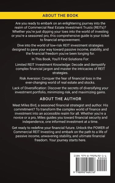 This Guide Can Help You Take Control of Your Future! Here is just a fraction of the power you will discover:Proven methods for building a resilient, low-risk REIT portfolio with maximum earning potential. Read about what Commercial Real Estate Investment Trusts (REITs) are and how they work in the real world. Discover why Commercial REITs are the hidden gem of the investment universe. Master the art of partnering with top-tier REIT operators, selecting the right markets, assembling a winning team, and analyzing promising deals. Step into your first Commercial REIT investment with a clear, action-ready plan! The key to achieving financial freedom through REITs - and why it's closer than you think. A breakdown of REIT subtypes and how to choose the best ones for your goals. REIT dividend sustainability and what to watch out for. Navigate market cycles with confidence as you gain expertise in Commercial REITs. A deep dive into risk management strategies to protect your REIT investments. Uncover the secrets of value investing with Commercial REITs. The role of tax optimization in your REIT portfolio for long-term financial gains. Master the art of real estate diversification and how it fortifies your investments. Harness the power of Commercial REITs to create a reliable income stream. FREE Bonus Chapter INCLUDED!!! - Tips & Strategies in an Unspoken Sector "I'm not a financial expert; I won't understand it." Don't let complex jargon scare you away. This book breaks down Commercial REIT investing into easy-to-understand concepts. You'll gain the confidence to navigate the world of real estate trusts, whether you're a beginner or an experienced investor. "I'm afraid of losing my hard-earned money." Worried about risk? We've got you covered. Our guide focuses on low-risk REIT strategies, helping you build a portfolio prioritizing financial stability and passive income. You'll learn how to manage and mitigate risks effectively.