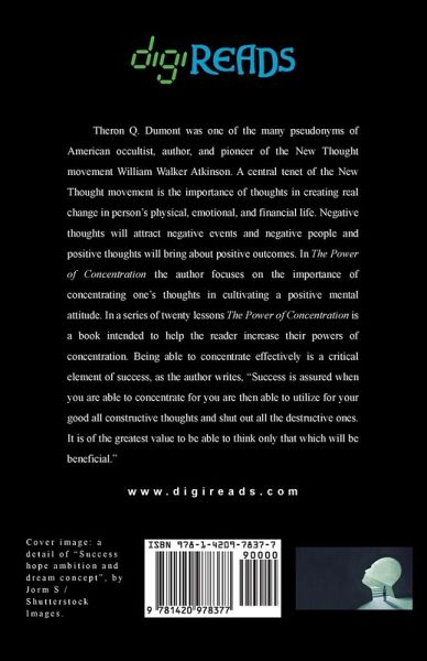 Theron Q. Dumont was one of the many pseudonyms of American occultist, author, and pioneer of the New Thought movement William Walker Atkinson. A central tenet of the New Thought movement is the importance of thoughts in creating real change in person's physical, emotional, and financial life. Negative thoughts will attract negative events and negative people and positive thoughts will bring about positive outcomes. In "The Power of Concentration" the author focuses on the importance of concentrating one's thoughts in cultivating a positive mental attitude. In a series of twenty lessons "The Power of Concentration" is a book intended to help the reader increase their powers of concentration. Being able to concentrate effectively is a critical element of success, as the author writes, "Success is assured when you are able to concentrate for you are then able to utilize for your good all constructive thoughts and shut out all the destructive ones. It is of the greatest value to be able to think only that which will be beneficial." This edition is printed on premium acid-free paper.