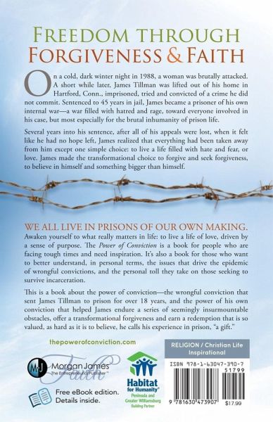 James Tillman was stretched out on his basement couch, relaxing after a long day of work at the car wash, the smell of sweet onions and simmering steak filling the air of his modest apartment in the projects of Hartford, Conn. His mother, a bible perched nearby, was softly singing a hymn when she was shaken by the thundering sound of pounding on the front door. It wasn't a knock; it was an act of sheer force. In an instant, the police burst in, lifted James out of his home and shoved him into prison, arresting him for the brutal rape of a young corporate executive. For over 18 years, James professed his innocence, through the investigation, trial, appeals, and to anyone who would listen. Finally, after a series of extraordinary events, the Connecticut Innocence Project took up James' case, eventually winning his freedom-the first person to be exonerated in the state through the use of DNA. This is an inspirational story about the power of conviction: the wrongful conviction that sent James Tillman to prison for over 18 years, and the power of his own conviction that helped him persevere, offer a transformational forgiveness and earn a redemption that is so valued he remarkably calls his experience in prison, "a gift." "The Power of Conviction" is for people who are facing tough times. You will understand that you're not alone, that things can be brutally bad and we can react poorly at times, but where there is love, there is always hope. How did James Tillman endure 18 years of hell in prison? What specific lessons can you learn about the transformational power of forgiveness, love and conviction? When faced with your own challenges in life, what will you choose?