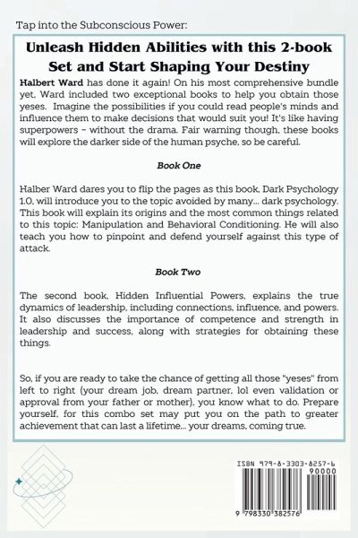 Tap into the Subconscious Power: Unleash Hidden Abilities with this 2-book Set and Start Shaping Your Destiny Halbert Ward has done it again! On his most comprehensive bundle yet, Ward included two exceptional books to help you obtain those yeses. Imagine the possibilities if you could read people's minds and influence them to make decisions that would suit you! It's like having superpowers -without the drama. Fair warning though, these books will explore the darker side of the human psyche, so be careful. Book One Halbert Ward dares you to flip the pages as this book, Dark Psychology 1.0, will introduce you to the topic avoided by many... dark psychology. This book will explain its origins and the most common things related to this topic: Manipulation and Behavioral Conditioning. He will also teach you how to pinpoint and defend yourself against this type of attack. Book Two The second book, Hidden Influential Powers, explains the true dynamics of leadership, including connections, influence, and powers. It also discusses the importance of competence and strength in leadership and success, along with strategies for obtaining these things. So, if you are ready to take the chance of getting all those "yeses" from left to right (your dream job, dream partner, lol even validation or approval from your father or mother), you know what to do. Prepare yourself, for this combo set may put you on the path to greater achievement that can last a lifetime... your dreams, coming true.