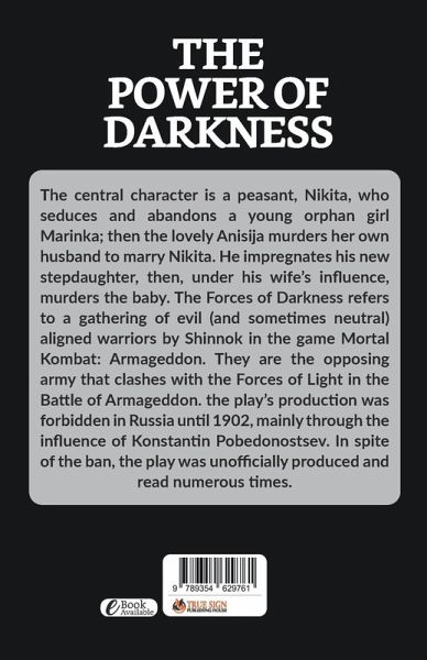 The central character is a peasant, Nikita, who seduces and abandons a young orphan girl Marinka; then the lovely Anisija murders her own husband to marry Nikita. He impregnates his new stepdaughter, then, under his wife's influence, murders the baby. The Forces of Darkness refers to a gathering of evil (and sometimes neutral) aligned warriors by Shinnok in the game Mortal Kombat: Armageddon. They are the opposing army that clashes with the Forces of Light in the Battle of Armageddon. the play's production was forbidden in Russia until 1902, mainly through the influence of Konstantin Pobedonostsev. In spite of the ban, the play was unofficially produced and read numerous times.