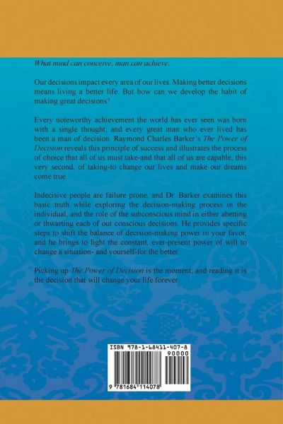 What mind can conceive, man can achieve. Our decisions impact every area of our lives. Making better decisions means living a better life. But how can we develop the habit of making great decisions? Every noteworthy achievement the world has ever seen was born with a single thought; and every great man who ever lived has been a man of decision. Raymond Charles Barker's The Power of Decision reveals this principle of success and illustrates the process of choice that all of us must take-and that all of us are capable, this very second, of taking-to change our lives and make our dreams come true. Indecisive people are failure prone, and Dr. Barker examines this basic truth while exploring the decision-making process in the individual, and the role of the subconscious mind in either abetting or thwarting each of our conscious decisions. He provides specific steps to shift the balance of decision-making power in your favor, and he brings to light the constant, ever-present power of will to change a situation- and yourself-for the better. Picking up The Power of Decision is the moment; and reading it is the decision that will change your life forever.