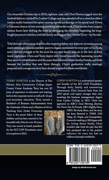 On a beautiful October day in 2010, eighteen-year-old Chris Norton jogged onto the football field on a kickoff for Luther College and was wheeled off on a stretcher after a routine tackle fractured his spine causing significant damage to his spinal cord. Given a 3 percent chance of ever moving anything below the neck, Chris awoke from surgery sixteen hours later defying the odds by shrugging his shoulder, beginning his long-fought journey to recovery with his family and biggest fan-father Terry-by his side. Told through alternating chapters, this inspiring father-son memoir recounts a young man's seemingly insurmountable quest to regain movement in every part of his body, and a father's struggle to be the rock his son and family lean on in the face of their worst nightmare. Chris and Terry depict with brutal honesty the harrowing months they spent in rehabilitation and the years that followed where family, friends, and faith became the nucleus that saw them through. Chris's graduation walk, marriage proposal, and courageous story have already inspired millions worldwide.