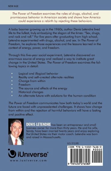 A baby boomer growing up in the 1960s, author Denis Letendre lived life to the fullest, truly embodying the slogan of the times: "Sex, drugs, and rock and roll." For five years after graduating from high school, Letendre experimented with drugs, alcohol, and sex. In The Power of Freedom, he explores those experiences and the lessons learned in the context of energy, power, and freedom. Through this five-year social experiment, Letendre discovered an enormous source of energy and realized a way to institute great change in the United States. The Power of Freedom examines the following topics in detail: ¿ Logical and illogical behavior ¿ Reality and self-created alternate realities ¿ Change from within ¿ Freedom ¿ The source and effects of the energy ¿ Historical changes ¿ An alternate future with solutions for the human condition The Power of Freedom communicates how both today's world and the future are faced with unprecedented challenges. It shows how change from within and the rejection of harmful behaviors will have a lasting and positive effect.