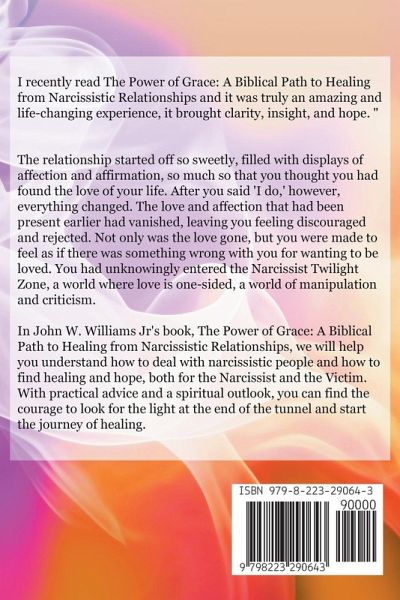 "I recently read The Power of Grace: A Biblical Path to Healing from Narcissistic Relationships and it was truly an amazing and life-changing experience, it brought clarity, insight, and hope. " The relationship started off so sweetly, filled with displays of affection and affirmation, so much so that you thought you had found the love of your life. After you said 'I do,' however, everything changed. The love and affection that had been present earlier had vanished, leaving you feeling discouraged and rejected. Not only was the love gone, but you were made to feel as if there was something wrong with you for wanting to be loved. You had unknowingly entered the Narcissist Twilight Zone, a world where love is one-sided, a world of manipulation and criticism. In John W. Williams Jr's book, The Power of Grace: A Biblical Path to Healing from Narcissistic Relationships, we will help you understand how to deal with narcissistic people and how to find healing and hope, both for the Narcissist and the Victim. With practical advice and a spiritual outlook, you can find the courage to look for the light at the end of the tunnel and start the journey of healing.