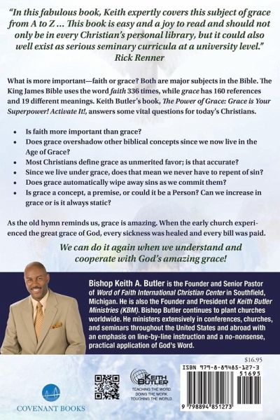 In this fabulous book, Keith expertly covers this subject of grace from A to Z. This book is easy and a joy to read and should not only be in every Christian's personal library, but it could also well exist as serious seminary curricula at a university level. --Rick Renner What is more important, faith or grace? Both are major subjects in the Bible. The King James Bible uses the word faith 336 times, while grace has 160 references and 19 different meanings. Keith Butler's book The Power of Grace: Grace Is Your Superpower! Activate It! answers some vital questions for today's Christians. Is faith more important than grace? Does grace overshadow other biblical concepts since we now live in the age of grace? Most Christians define grace as unmerited favor. Is that accurate? Since we live under grace, does that mean we never have to repent of sin? Does grace automatically wipe away sins as we commit them? Is grace a concept, a premise, or could it be a Person? Can we increase in grace, or is it always static? As the old hymn reminds us, grace is amazing. When the early church experienced the great grace of God, every sickness was healed, and every bill was paid. We can do it again when we understand and cooperate with God's amazing grace!