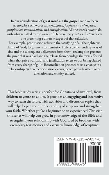 Explore the depths of the Gospel and uncover the meaning behind six great words: propitiation, forgiveness, redemption, justification, reconciliation, and sanctification. Delve into the full significance of each term and its implications for our salvation. With detailed explanations and insight, this book invites readers on a journey to discover the "so great a salvation" of which the writer of Hebrews speaks. Our relationship with God can be completely redefined by understanding this vital language of the Gospel.