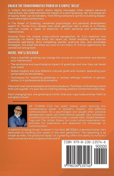 UNLOCK THE TRANSFORMATIVE POWER OF A SIMPLE 'HELLO' In today's fast-paced world, where digital messages often replace personal interactions, we underestimate the impact of a warm greeting. Yet, the simple act of saying 'hello' can do wonders, from lifting someone's spirits to building deeper, more meaningful connections. In The Power of Greeting, renowned psychologist and personal development expert Dr. Florian Ezui reveals how small gestures-like a smile or a friendly nod-can create a ripple of positivity in both personal and professional relationships. Drawing from his unique cross-cultural perspective, Dr. Ezui explores how greetings, no matter how brief, can spark joy, foster empathy, and improve emotional well-being. With compelling stories, practical tips, and actionable strategies, this book will show you how to turn every 'hi' into an opportunity for connection and growth. INSIDE, YOU'LL DISCOVER: ¿ How a heartfelt greeting can change the course of a conversation and elevate your interactions. ¿ The emotional and psychological impact of greetings and how they can boost your mood. . Global insights into how different cultures greet and connect, expanding your social skills across borders. ¿ Techniques for mastering greetings in various settings-whether in person, online, or in professional environments. Filled with real-world examples and practical advice, The Power of Greeting is more than just a guide-it's your key to creating lasting, positive connections every day. Start changing lives, one greeting at a time. Grab your copy today and say 'hello' to a brighter future!