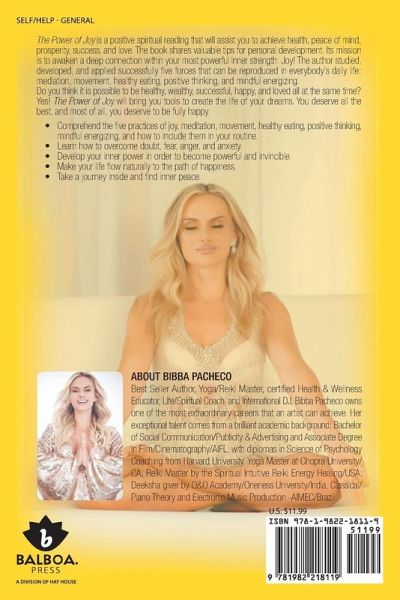 The Power of Joy is a positive spiritual reading that will assist you to achieve health, peace of mind, prosperity, success, and love. The book shares valuable tips for personal development. Its mission is to awaken a deep connection within your most powerful inner strength: Joy! The author studied, developed, and applied successfully five forces that can be reproduced in everybody's daily life: mediation, movement, healthy eating, positive thinking, and mindful energizing. Do you think it is possible to be healthy, wealthy, successful, happy, and loved all at the same time? Yes! The Power of Joy will bring you tools to create the life of your dreams. You deserve all the best, and most of all, you deserve to be fully happy. ¿ Comprehend the five practices of joy, meditation, movement, healthy eating, positive thinking, mindful energizing, and how to include them in your routine. ¿ Learn how to overcome doubt, fear, anger, and anxiety. ¿ Develop your inner power in order to become powerful and invincible. ¿ Make your life flow naturally to the path of happiness. ¿ Take a journey inside and find inner peace.