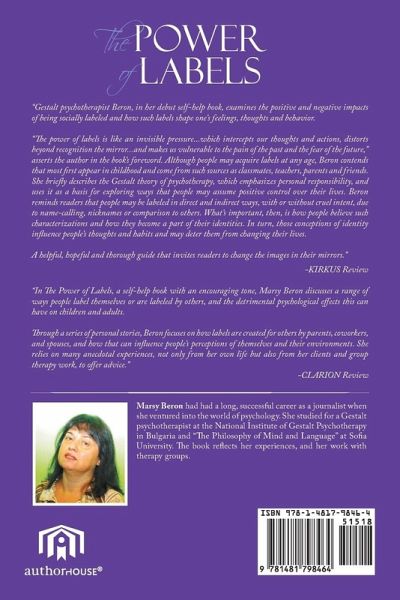 " ""Gestalt psychotherapist Beron, in her debut self-help book, examines the positive and negative impacts of being socially labeled and how such labels shape one's feelings, thoughts and behavior. ""The power of labels is like an invisible pressure...which intercepts our thoughts and actions, distorts beyond recognition the mirror...and makes us vulnerable to the pain of the past and the fear of the future,"" asserts the author in the book's foreword. Although people may acquire labels at any age, Beron contends that most first appear in childhood and come from such sources as classmates, teachers, parents and friends. She briefly describes the Gestalt theory of psychotherapy, which emphasizes personal responsibility, and uses it as a basis for exploring ways that people may assume positive control over their lives. Beron reminds readers that people may be labeled in direct and indirect ways, with or without cruel intent, due to name-calling, nicknames or comparison to others. What's important, then, is how people believe such characterizations and how they become a part of their identities. In turn, those conceptions of identity influence people's thoughts and habits and may deter them from changing their lives. A helpful, hopeful and thorough guide that invites readers to change the images in their mirrors."" ? KIRKUS Review ""In The Power of Labels, a self-help book with an encouraging tone, Marsy Beron discusses a range of ways people label themselves or are labeled by others, and the detrimental psychological effects this can have on children and adults. Through a series of personal stories, Beron focuses on how labels are created for others by parents, coworkers, and spouses, and how that can influence people's perceptions of themselves and their environments. She relies on many anecdotal experiences, not only from her own life but also from her clients and group therapy work, to offer advice."" ?CLARION Review"