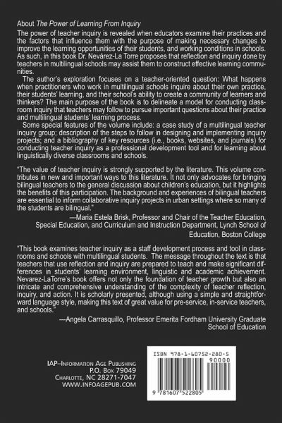 A volume in Adult Education Special Topics: Theory, Research, and Practice in Lifelong Learning Series Editor: Kathleen P. King, Fordham University The power of teacher inquiry is revealed when educators examine their practices and the factors that influence them with the purpose of making necessary changes to improve the learning opportunities of their students, and working conditions in schools. As such, in this book the author proposes that reflection and inquiry done by teachers in multilingual classrooms and schools may assist them to construct effective learning communities. In this book, Dr. Nevárez-La Torre examines different ways to reflect and conduct teacher inquiry in instructional settings where students speak more than one language. Her exploration focuses on a teacher-oriented question: What happens when practitioners who work in multilingual schools inquire about their own practice, their students' learning, and their school's ability to create a community of learners and thinkers? The main purpose of the book is to delineate a model for conducting classroom inquiry that teachers may follow to pursue important questions about their practice and multilingual students' learning process. Some special features of the volume include: a case study of a multilingual teacher inquiry group; description of the steps to follow in designing and implementing inquiry projects; and a bibliography of key resources (i.e., books, websites, and journals) for conducting teacher inquiry as a professional development tool and for learning about linguistically diverse classrooms and schools. There are eight chapters in this book divided into three sections. Although the sections are thematically connected, the reader may use them independently of each other. The first section introduces the idea for the book, the author as a practitioner-researcher, and the main practical and conceptual issues discussed in the book. In addition, there is a chapter that introduces a model for using teacher inquiry as a tool for professional development. The second section includes the analyses of the trajectory followed by three teachers into using teacher inquiry to grow as professionals in ESL and bilingual classrooms. The third section of the book situates professional development using teacher inquiry within a broader theoretical framework supported by other research done by academicians in various educational fields. It also examines some key implications of this work for the education of in-service and pre-service teachers.