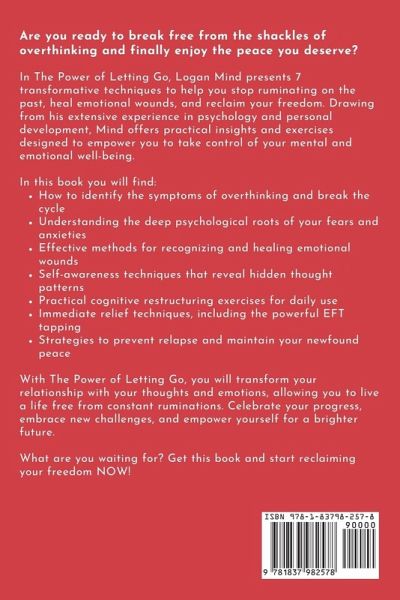 What if you could finally let go of the past and discover a life of emotional freedom? Do you find yourself constantly overthinking past events? Are you tired of emotional wounds holding you back from truly enjoying life? Have you tried numerous methods to heal, but nothing seems to work? If so, then The Power of Letting Go is for you. Imagine a life where your mind is no longer a battlefield of constant ruminations. Picture yourself free from the grip of overthinking, confidently moving forward without the weight of emotional baggage. Even if you've struggled for years, the transformation you seek is within reach. Written by the esteemed Logan Mind, an expert in psychology and human behavior, this book provides a step-by-step guide to breaking free from the chains of overthinking and emotional wounds. Logan's unique approach combines his academic expertise with practical techniques that have helped countless individuals achieve emotional freedom. In The Power of Letting Go, you'll discover: But that's not all! Along with this book, you'll receive Complimentary Downloadable Resources: ¿ 21-Day Challenge: A practical guide to implement the techniques in the book, helping you to solidify new habits and experience lasting change.¿ 101+ Mantras for Releasing Emotional Baggage: Powerful affirmations designed to reprogram your thoughts and foster a positive mindset.¿ Emotional Regulation Essentials: A comprehensive toolkit with exercises and strategies to help you maintain emotional stability. Envision how your life will change once you stop overthinking the past and begin to heal. With the guidance provided in this book, you can finally enjoy the freedom you deserve. Even if you feel like you're stuck in a cycle of overthinking and emotional pain, The Power of Letting Go offers practical solutions that work for everyone, from corporate executives and entrepreneurs to students and stay-at-home parents. If you're ready to transform your life and achieve emotional freedom, scroll up and order the book now!