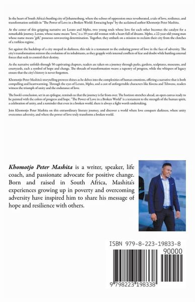 In the heart of South Africa's bustling city of Johannesburg, where the echoes of oppression once reverberated, a tale of love, resilience, and transformation unfolds in "The Power of Love in a Broken World: Emracing hope" by the acclaimed author Khomotjo Peter Mashita. At the center of this gripping narrative are Lerato and Mpho, two young souls whose love for each other becomes the catalyst for a remarkable journey. Lerato, whose name means "love," is a 19-year-old woman with a heart full of dreams. Mpho, a 22-year-old young man whose name means "gift," possesses unwavering determination. Together, they embark on a mission to reclaim their city from the clutches of a ruthless regime. Set against the backdrop of a city steeped in darkness, this tale is a testament to the enduring power of love in the face of adversity. The city's transformation mirrors the evolution of its inhabitants, as they grapple with internal conflicts of fear and doubt while battling external forces that seek to control their destiny. As the narrative unfolds through 50 captivating chapters, readers are taken on a journey through parks, gardens, sculptures, museums, and courtyards, each a symbol of hope and change. The threads of transformation weave a tapestry of progress, while the whispers of legacy ensure that the city's history is never forgotten. Khomotjo Peter Mashita's storytelling prowess shines as he delves into the complexities of human emotions, offering a narrative that is both compelling and heartwarming. Through the eyes of Lerato, Mpho, and a cast of unforgettable characters like Kwena and Tshwene, readers witness the triumph of unity and the endurance of love. The book's conclusion, set in an epilogue, reminds us that the journey is far from over. The horizon stretches ahead, an open canvas ready to be painted with the colors of progress and hope. "The Power of Love in a Broken World: Fight for Your Love" is a testament to the strength of the human spirit, a celebration of unity, and a reminder that even in a broken world, there is always a fight worth undertaking. Join Khomotjo Peter Mashita on this extraordinary literary journey, and discover a world where love conquers darkness, where unity overcomes adversity, and where the power of love truly transforms a broken world.