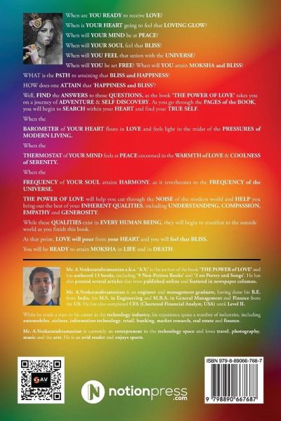 When are YOU READY to receive LOVE? When is YOUR HEART going to feel that LOVING GLOW? When will YOUR MIND be at PEACE? When will YOUR SOUL feel that BLISS? When will YOU FEEL that union with the UNIVERSE? When will YOU be set FREE? When will YOU attain MOKSHA and BLISS? WHAT is the PATH to attaining that BLISS and HAPPINESS? HOW does one ATTAIN that 'HAPPINESS and BLISS'? Well, FIND the ANSWERS to those QUESTIONS, as the book 'THE POWER OF LOVE' takes you on a journey of ADVENTURE & SELF DISCOVERY. As you go through the PAGES of the BOOK, you will begin to SEARCH within your HEART and find your TRUE SELF. When the BAROMETER of YOUR HEART floats in LOVE and feels light in the midst of the PRESSURES of MODERN LIVING. When the THERMOSTAT of YOUR MIND feels at PEACE cocooned in the WARMTH of LOVE & COOLNESS of SERENITY. When the FREQUENCY of YOUR SOUL attains HARMONY, as it reverberates to the FREQUENCY of the UNIVERSE. THE POWER OF LOVE will help you cut through the NOISE of the modern world and HELP you bring out the best of your INHERENT QUALITIES, including UNDERSTANDING, COMPASSION, EMPATHY and GENEROSITY. While these QUALITIES exist in EVERY HUMAN BEING, they will begin to manifest to the outside world as you finish this book. At that point, LOVE will pour from your HEART and you will feel that BLISS. You will be READY to attain MOKSHA in LIFE and in DEATH.