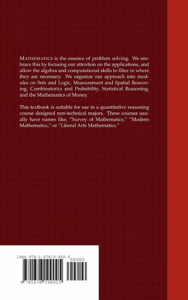 Mathematics is the essence of problem solving. We embrace this by focusing our attention on the applications, and allow the algebra and computational skills to filter in where they are necessary. We organize our approach into modules on Sets and Logic, Measurement and Spatial Reasoning, Combinatorics and Probability, Statistical Reasoning, and the Mathematics of Money. This textbook is suitable for use in a quantitative reasoning course designed non-technical majors. These courses usually have names like, "Survey of Mathematics," "Modern Mathematics," or "Liberal Arts Mathematics."