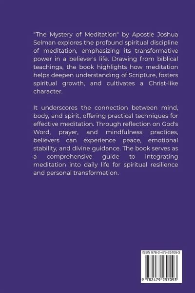 In "The Mystery of Meditation," meditation is unveiled not just as a technique for quieting the mind but as a profound spiritual discipline that transforms lives. From biblical texts to contemporary Christian practices, meditation is explored as an essential tool for spiritual growth and emotional well-being. The book delves into the deep connection between meditation and personal transformation, emphasising how it brings believers closer to God, fosters understanding of Scripture, and cultivates a Christ-like character. The journey of meditation in Christianity goes beyond mere reflection; it is a practice that integrates the mind, body, and spirit, helping believers live by God's will. Scriptures like Psalm 1:2-3 and Joshua 1:8 emphasise the importance of continuously meditating on God's Word, promising blessings and prosperity. The book highlights that when believers meditate deeply on scripture, they unlock layers of meaning and receive divine insight that helps them apply God's teachings to their everyday lives. A key focus of "The Mystery of Meditation" is its transformative power on the believer's spiritual and emotional state. By engaging in regular meditation, individuals not only deepen their understanding of Scripture but also experience a change in their thoughts and attitudes. As the Apostle Paul writes in Romans 12:2, transformation comes through the renewal of the mind, which is facilitated by meditation. This process leads to a more Christ-like character, grounded in humility, love, and wisdom. Meditation enhances the believer's prayer life by making it more focused and meaningful. It prepares believers for deeper communion with God, enabling them to hear God's voice more clearly and receive guidance. Historical Christian figures, such as St. Teresa of Avila, emphasized contemplative prayer, which merges meditation with prayer for profound spiritual encounters. Through meditation, Christians experience a renewed sense of peace and emotional stability. It helps reduce stress, anxiety, and distractions, fostering a state of mental clarity that is essential for spiritual focus. Integrating mindfulness and meditation techniques, such as breath prayer and visualising Scripture, offers a holistic approach to emotional and spiritual health. By incorporating meditation into daily life, believers build a strong foundation of faith, capable of withstanding life's challenges, and remain aligned with God's will in their decision-making. "The Mystery of Meditation" also provides practical guidelines on how to meditate effectively. From choosing the right environment to setting a consistent practice, the book is a comprehensive guide for anyone seeking to integrate meditation into their spiritual journey. It emphasises that meditation is not a one-time event but a continual renewal process, inviting the Holy Spirit to lead the believer into more profound understanding and divine encounters. This practice is a cornerstone of Christian spirituality, offering a path to wisdom, peace, healing, and overall well-being. Through meditation, believers can truly experience God's presence and begin living a life aligned with His will, filled with divine guidance and spiritual resilience.