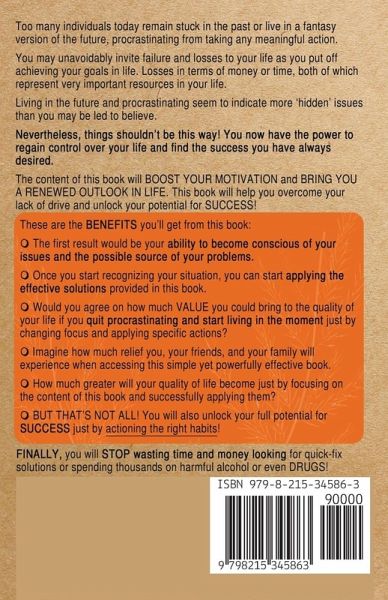 'Benjamin Franklin' once said, "Don't put off until tomorrow… What you can do today." That is correct! The present is your gift, the past, your lessons, and your driving force is the future. But too many individuals today remain stuck in the past or live in a fantasy version of the future, procrastinating from taking any meaningful action. You may unavoidably invite failure and losses to your life as you put off achieving your goals in life. Losses in terms of money or time, both of which represent very important resources in your life. Living in the future and procrastination seem to indicate more 'hidden' issues than you may be led to believe. Everybody wants to have a happier and more prosperous life. The problem is that this still looks to be a dream. People frequently struggle to handle the actual pressures. To make matters worse, it appears that people are now turning to false cures like alcohol to lessen the awful sensation they have when they put off tasks or procrastinate. A generation of dysfunctional people that have a wide range of disorders that cause emotional problems and social stigma are something the world is helplessly battling. Nevertheless, things shouldn't be this way! You now have the power to regain control over your life and find the success you have always desired. Enough of unhappy people who are too afraid to live! Enough of seeing so many people failing to experience every moment of their lives and make things happen for themselves. This book contains creative and practical suggestions that will bring back a sense of peace, direction, and drive to people and help restore their entire well-being. This book is designed to give you practical solutions to change your life. The content of this book will boost your motivation and bring you a renewed outlook in life. This book will help you overcome your lack of drive and unlock your potential for success. Now imagine how much more improved your life would be if you read this book.The first result would be your ability to become conscious of your issues and the possible source of your problems. Once you start recognizing your situation, you can start applying the effective solutions provided in this book. Would you agree on how much value you could bring to the quality of your life if you quit procrastinating and start living in the moment just by changing focus and applying specific actions? Imagine how much relief you, your friends, and your family will experience when accessing this simple yet powerfully effective book. How much greater will your quality of life become just by focusing on the content of this book and successfully applying them? You will also unlock your full potential for success just by actioning the right habits. Finally, you will stop wasting time and money looking for quick-fix solutions or spending thousands on harmful alcohol or even drugs. If you desire the life of stress-free and happiness, you must read this book.
