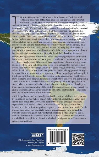 The significance of this book is its uniqueness. First, the book contains a collection of fourteen chapters that capture the personal, professional, and historical experiences of international global scholars and artists to which they were subjected in their native country and after they immigrated to the United States. What makes this book project highly unusual in comparison to other publications is that these international global scholars and artists experienced historical events of trauma and joy in their native country and in their newly adopted country of the United States that lie deeply buried in their sub-consciousness; that these memories are unforgettable and still painful for them; that these memories are a constant companion in their daily lives; and that the experienced historical events of trauma and joy have shaped their professional and personal lives to this very day. There exists a paucity in the global education literature of this far-reaching topic and, thus, it has the potential to enhance and diversify the global education literature. Second, the significance of this book lies in the pedagogical power of the oral history narrative tradition and its impact on students at the secondary and tertiary levels in education. When one's lived experiences of trauma or joy occur during a critical time in history, they rarely yield unforgotten memories and deeply held private knowledge that do not come to light without a storyteller. When first-hand accounts are shared publicly, they can bring powerful insights into past historic events to the very presence. Thus, the pedagogical strength of this book contributes to knowledge creation in the classroom as oral histories move students from abstract textbook descriptions to concrete and compelling "lived" stories associated with historical happenings. This pedagogy leads students to become more critical of historical events of the past and develops in them a deeper understanding of the past. Consequently, oral history narratives enable teachers and teacher educators to enrich the abstract text of textbooks with the authentic voice of the individual. A third significance of this book lies embedded in the rich historical perspective displayed by storytellers of non-native international global scholars and artists from around the world who portray their lived-through, first-hand experiences such as child labor, communism, hate, hunger, fascism, fear, intolerance, discrimination, prejudice, poverty, war, protest, and death. Finally, a major purpose of this book is to expose young learners from around the world to empowering non-native international role models in global education and the arts from nations in Africa, Asia, the Caribbean, Eurasia, Europe, the Middle East, and South America who build bridges-not walls-between peoples and nations.