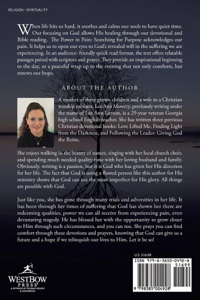 When life hits us hard, it soothes and calms our souls to have quiet time. Our focusing on God allows His healing through our devotional and Bible reading. The Power in Pain: Searching for Purpose acknowledges our pain. It helps us to open our eyes to God's revealed will in the suffering we are experiencing. In an audience- friendly quick read format, the text offers relatable passages paired with scripture and prayer. They provide an inspirational beginning to the day, or a peaceful wrap up to the evening that not only comforts, but renews our hope.