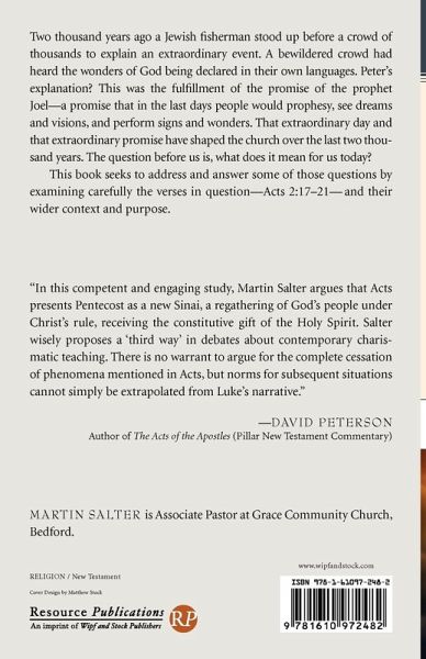 Synopsis: Two thousand years ago, a Jewish fisherman stood up before a crowd of thousands to explain an extraordinary event. A bewildered crowd had heard the wonders of God being declared in their own languages. Peter's explanation? This was the fulfillment of the promise of the prophet Joel--a promise that in the last days people would prophesy, see dreams and visions, and perform signs and wonders. That extraordinary day and that extraordinary promise have shaped the church over the last two thousand years. The question before us is, what does it mean for us today? This book seeks to address and answer some of those questions by examining carefully the verses in question, Acts 2:17-21, and their wider context and purpose. Endorsements: "In this competent and engaging study, Martin Salter argues that Acts presents Pentecost as a new Sinai, a regathering of God's people under Christ's rule, receiving the constitutive gift of the Holy Spirit. Salter wisely proposes a 'third way' in debates about contemporary charismatic teaching. There is no warrant to argue for the complete cessation of phenomena mentioned in Acts, but norms for subsequent situations cannot simply be extrapolated from Luke's narrative." --David Peterson Author of The Acts of the Apostles (Pillar New Testament Commentary) Author Biography: Martin Salter is Associate Pastor at Grace Community Church, Bedford.