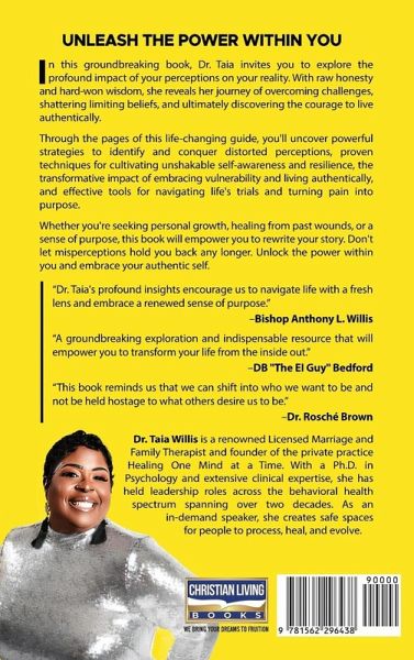 Unleash the Power Within You In this transformative book, Dr. Taia explores how our perceptions shape our reality. With candid vulnerability and hard-earned wisdom, she shares her journey of overcoming adversity, challenging limiting beliefs, and embracing her authentic self. This compelling guide offers: Powerful strategies to identify and overcome distorted perceptions Proven techniques for developing robust self-awareness and resilience Insights on the transformative power of vulnerability and authenticity Effective tools for navigating life's challenges and finding purpose in pain Blending personal stories, psychological expertise, and practical advice, Dr. Taia provides a clear path to reshape your perceptions and unlock your full potential. Whether you're pursuing personal growth, healing, or seeking purpose, this book empowers you to rewrite your narrative and create a life of profound meaning and joy. Break free from limiting perceptions, discover your inner strength, and embrace your true self with The Power of Perception. A companion workbook is also available. "Dr. Taia's profound insights encourage us to navigate life with a fresh lens and embrace a renewed sense of purpose." -Bishop Anthony L. Willis "A groundbreaking exploration and indispensable resource that will empower you to transform your life from the inside out." -DB "The EI Guy" Bedford "This book reminds us that we can shift into who we want to be and not be held hostage to what others desire us to be." -Dr. Rosché Brown LCP