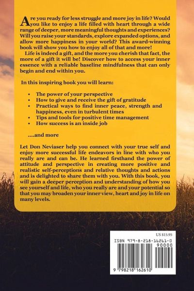Are you ready for less struggle and more joy in life? Would you like to enjoy a life filled with heart through a wide range of deeper, more meaningful thoughts and experiences? Will you raise your standards, explore expanded options, and allow more happiness in your world? This award-winning book will show you how to enjoy all of that and more! Life is indeed a gift, and the more you cherish that fact, the more of a gift it will be! Discover how to access your inner essence with a reliable baseline mindfulness that can only begin and end within you. In this inspiring book you will learn:The power of your perspective How to give and receive the gift of gratitude Practical ways to find inner peace, strength and happiness, even in turbulent times Tips and tools for positive time management How success is an inside job ....and more Let Don Neviaser help you connect with your true self and enjoy more successful life endeavors in line with who you really are and can be. He learned firsthand the power of attitude and perspective in creating more positive and realistic self-perceptions and relative thoughts and actions and is delighted to share them with you. With this book, you will gain a deeper perception and understanding of how you see yourself and life, who you really are and your potential so that you may broaden your inner view, heart and joy in life on many levels.
