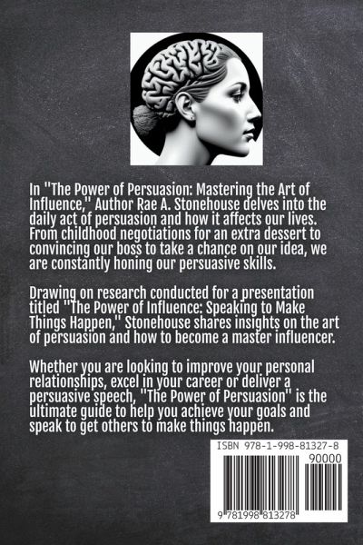 In "The Power of Persuasion: Mastering the Art of Influence," Author Rae A. Stonehouse delves into the daily act of persuasion and how it affects our lives. From childhood negotiations for an extra dessert to convincing our boss to take a chance on our idea, we are constantly honing our persuasive skills. Drawing on research conducted for a presentation titled "The Power of Influence: Speaking to Make Things Happen," Stonehouse shares insights on the art of persuasion and how to become a master influencer. Whether you are looking to improve your personal relationships, excel in your career or deliver a persuasive speech, "The Power of Persuasion" is the ultimate guide to help you achieve your goals and speak to get others to make things happen.