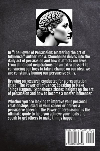 In "The Power of Persuasion: Mastering the Art of Influence," Author Rae A. Stonehouse delves into the daily act of persuasion and how it affects our lives. From childhood negotiations for an extra dessert to convincing our boss to take a chance on our idea, we are constantly honing our persuasive skills. Drawing on research conducted for a presentation titled "The Power of Influence: Speaking to Make Things Happen," Stonehouse shares insights on the art of persuasion and how to become a master influencer. Whether you are looking to improve your personal relationships, excel in your career or deliver a persuasive speech, "The Power of Persuasion" is the ultimate guide to help you achieve your goals and speak to get others to make things happen.