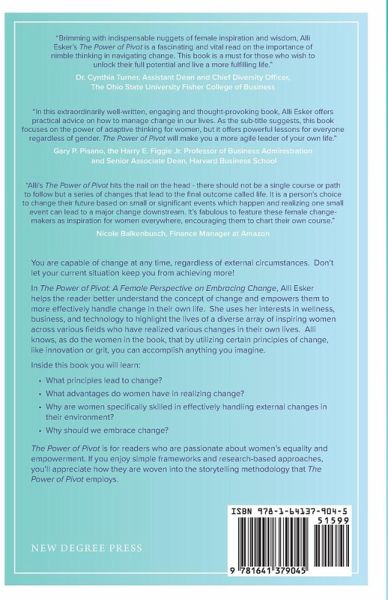 You are capable of change at any time, regardless of external circumstances. Don't let your current situation keep you from achieving more! In The Power of Pivot: A Female Perspective on Embracing Change, Alli Esker helps the reader better understand the concept of change and empowers them to more effectively handle change in their own life. She uses her interests in wellness, business, and technology to highlight the lives of a diverse array of inspiring women across various fields who have realized various changes in their own lives. Alli knows, as do the women in the book, that by utilizing certain principles of change, like innovation or grit, you can accomplish anything you imagine. Inside this book you will learn:What principles lead to change? What advantages do women have in realizing change? Why are women specifically skilled in effectively handling external changes in their environment? Why should we embrace change? The Power of Pivot is for readers who are passionate about women's equality and empowerment. If you enjoy simple frameworks and research-based approaches, you'll appreciate how they are woven into the storytelling methodology that The Power of Pivot employs.