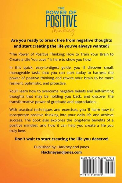 Experience feeling free... Are you ready to unlock the life you've always wanted? "The Power of Positive Thinking: Train Your Brain To Create A Life You Love" is here to show you how! In this quick, easy-to-digest guide, you'll discover small, manageable tasks that you can start today to harness the power of positive thinking and rewire your brain to be more resilient, optimistic, and proactive. You'll learn how to overcome negative beliefs and self-limiting thoughts that may be holding you back, and discover the transformative power of gratitude and appreciation. With practical techniques and exercises, you'll learn how to incorporate positive thinking into your daily life and achieve success. The book also explores the long-term benefits of a positive mindset, and how it can help you create a life you truly love. Don't wait to start creating the life you deserve! "The Power of Positive Thinking" provides you with the tools, knowledge and easy task to start making positive changes in your life today.