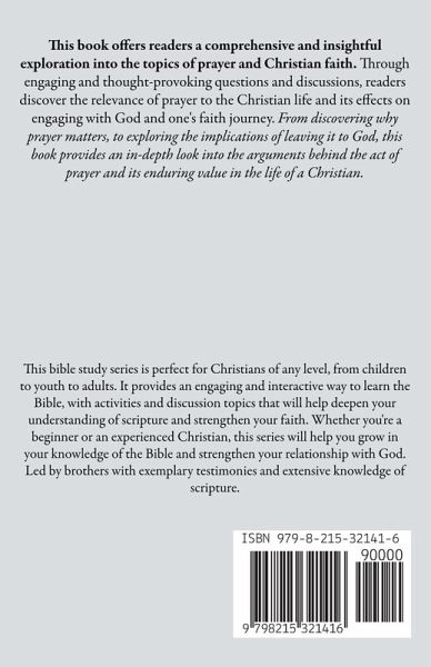 This book offers readers a comprehensive and insightful exploration into the topics of prayer and Christian faith. Through engaging and thought-provoking questions and discussions, readers discover the relevance of prayer to the Christian life and its effects on engaging with God and one's faith journey. From discovering why prayer matters, to exploring the implications of leaving it to God, this book provides an in-depth look into the arguments behind the act of prayer and its enduring value in the life of a Christian.