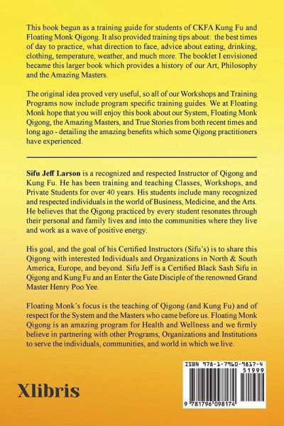 This book begun as a training guide for students of CKFA Kung Fu and Floating Monk Qigong. It also provided training tips about: the best times of day to practice, what direction to face, advice about eating, drinking, clothing, temperature, weather, and much more. The booklet I envisioned became this larger book which provides a history of our Art, Philosophy and the Amazing Masters. The original idea proved very useful, so all of our Workshops and Training Programs now include program specific training guides. We at Floating Monk hope that you will enjoy this book about our System, Floating Monk Qigong, the Amazing Masters, and True Stories from both recent times and long ago - detailing the amazing benefits which some Qigong practitioners have experienced.