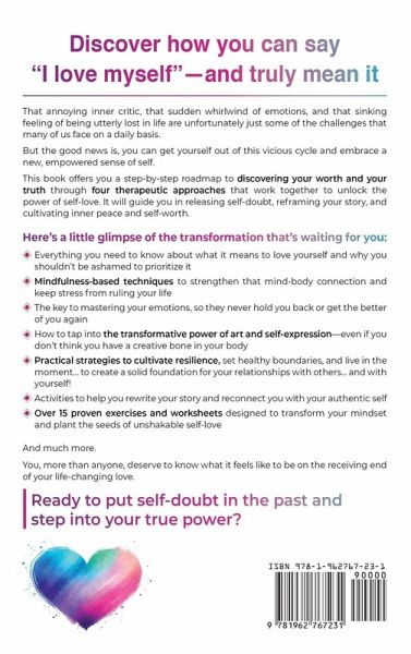 BONUS: 110+ customized journal pages and interactive worksheets designed to perfectly complement the journal prompts, steps, and exercises discussed in this book are available for download.Discover how to say "I love myself"-and truly mean it! This book offers you a step-by-step roadmap to discovering your worth and your truth through four therapeutic approaches-Mindfulness-Based Stress Reduction, Dialectical Behavior Therapy, Art Therapy, and Narrative Therapy-that work together to release self-doubt, reframe your story, and cultivate inner peace and self-worth. Here's a little glimpse of the transformation that's waiting for you: * Everything you need to know about what it means to love yourself and why you shouldn't be ashamed to prioritize it * Mindfulness-based techniques to strengthen that mind-body connection and keep stress from ruling your life * The key to mastering your emotions, so they never hold you back or get the better of you again * Practical strategies to cultivate resilience, set healthy boundaries, and live in the moment... to create a solid foundation for your relationships with others... and with yourself! * Activities to help you rewrite your story and reconnect you with your authentic self * Over 15 proven exercises and worksheets designed to transform your mindset and plant the seeds of unshakable self-love And much more. Ready to put self-doubt in the past and step into your true power? Then, scroll up and click the "Add to Cart" button right now.