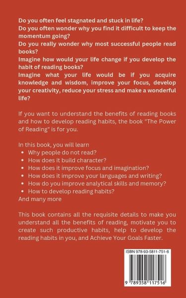 Do you often feel stagnated and stuck in life? Do you often wonder why you find it difficult to keep the momentum going? Do you really wonder why most successful people read books? Imagine how would your life change if you develop the habit of reading books? Imagine what your life would be if you acquire knowledge and wisdom, improve your focus, develop your creativity, reduce your stress and make a wonderful life? If you want to understand the benefits of reading books and how to develop reading habits, the book "The Power of Reading" is for you. In this book, you will learnWhy people do not read? How does it build character? How does it improve focus and imagination? How does it improve your languages and writing? How do you improve analytical skills and memory? How to develop reading habits? And many more This book contains all the requisite details to make you understand all the benefits of reading, motivate you to create such productive habits, help to develop the reading habits in you, and Achieve Your Goals Faster.