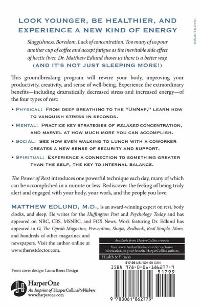 Look Younger, Be Healthier, and Experience a New Kind of Energy Sluggishness. Boredom. Lack of concentration. Too many of us pour another cup of coffee and accept fatigue as the inevitable side effect of hectic lives. Dr. Matthew Edlund shows us there is a better way. (and it's not just sleeping more!) This groundbreaking program will rewire your body, improving your productivity, creativity, and sense of well-being. Experience the extraordinary benefits?including dramatically decreased stress and increased energy?of the four types of rest: * Physical: From deep breathing to the "UnNap," learn how to vanquish stress in seconds. * Mental: Practice key strategies of relaxed concentration, and marvel at how much more you can accomplish. * Social: See how even walking to lunch with a coworker creates a new sense of security and support. * Spiritual: Experience a connection to something greater than the self, the key to internal balance. The Power of Rest introduces one powerful technique each day, many of which can be accomplished in a minute or less. Rediscover the feeling of being truly alert and engaged with your body, your work, and the people you love.