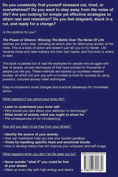 Do you constantly find yourself stressed out, tired, or overwhelmed? Do you want to step away from the noise of life? Are you looking for simple yet effective strategies to attain rest and relaxation? Do you feel stagnant, stuck in a rut, and ready for a change? Is this positive for you? The Power of Silence: Winning The Battle Over The Noise Of Life teaches you every step, including an action plan for destroying anxiety at the roots. This is a book of action and doesn't just tell you to try harder. Life rewards those who take matters into their own hands, and this book is where to start. This book is packed full of real-life examples for people who struggle with fear of people, proven techniques of that have worked for thousands of people just like you. These methods are backed up countless research studies, all which will arm you with a mindset primed for success by using powerful, concrete anxiety relief techniques. Easy-to-implement small changes and practical takeaways for immediate action. What happens if you ignore your busy life? ¿ Learn to understand your inner self. ¿ Why should you care about your addiction to technology? ¿ What levels of anxiety relief you ought to shoot for ¿ The consequences of not introspecting How will you learn to be free from your stress? ¿ Identify the source of your anxiety ¿ How can meditation help you kiss your burden goodbye ¿ Tricks for handling specific fears and emotional blocks ¿ How to develop habits that will improve your willpower and self-image What happens when you don't let life pass you by? ¿ Never wonder "what if" you could be free of your stress! ¿ Wake up every day with high energy and desire ¿ Inspire yourself and others to create the life they want with less stress. ¿ Feel comfortable with yourself again.