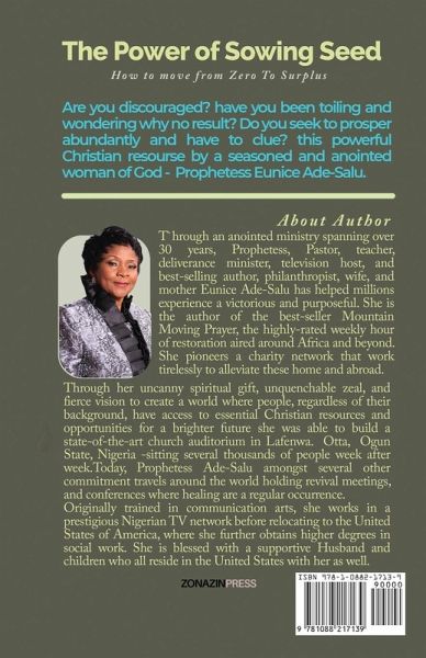 Are you discouraged? have you been toiling and wondering why no result? Do you seek to prosper abundantly and have to clue? this powerful Christian resource by a seasoned and anointed woman of God - Prophetess Eunice Ade-Salu. Just as each plant in the natural world is capable of reproduction, each financial seed you sow has the ability to reproduce. You have tremendous potential to reproduce when you invest it in God's Kingdom. "And God said, Let the earth bring forth grass, the herb yielding seed, and the fruit tree yielding fruit after his kind, whose seed is in itself, upon the earth: and it was so."Genesis 1:11. You must sow in order to harvest. In the natural world, if you don't sow you cannot reap. So it is in the spiritual you must sow in order to reap. God provides spiritual resources for you so you can invest in His kingdom. In order to bring forth life, it was necessary for Jesus to die on the cross. It was His sowing time. The dead in Christ rose. Through His death, there was a tremendous harvest. Sowing your spiritual seed requires spiritual death. A seed cannot replicate itself until it is first sown into the ground. Where you sow your seed depends on what soil you sow into Sow on fertile soil. When your seed is sown beside the water. Don't look at your circumstances to sow your seed but look and depend on God. As you sow your se be happy and trust in the Lord for multiple returns.