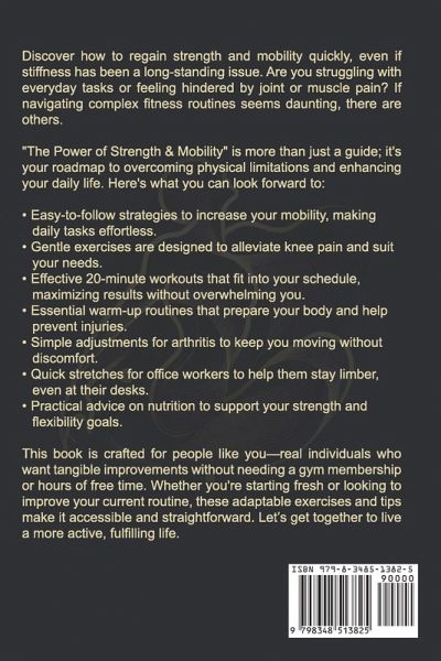 Transform Your Strength & Flexibility-No Intense Workouts Needed! Struggling with stiffness, pain, or limited mobility? You're not alone. This guide helps you regain energy and flexibility safely and efficiently-no grueling workouts required. Inside, You'll Learn: * Quick mobility drills to ease stiffness, even at a desk * 10-minute stretches to boost flexibility * Injury-preventing exercises to stay pain-free * Safe knee exercises for chronic pain relief * 20-minute full-body workouts-no equipment needed * Balance & stability training to prevent falls * Simple strength-building techniques with lasting results * Diet tips to enhance mobility and performance Designed for busy adults, these routines maximize results in minimal time-safely and effectively. Take control of your health and start feeling better today!