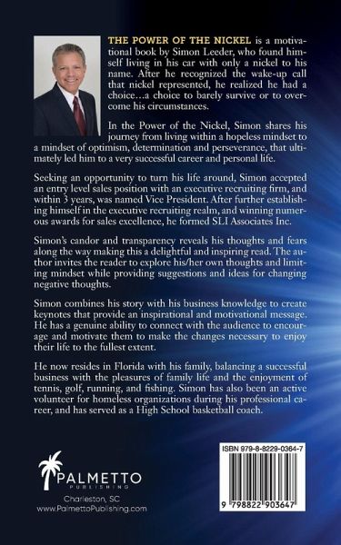 THE POWER OF THE NICKEL is a motivational book by Simon Leeder, who found himself living in his car with only a nickel to his name. After he recognized the wake-up call that nickel represented, he realized he had a choice...a choice to barely survive or to overcome his circumstances. In the Power of the Nickel, Simon shares his journey from living within a hopeless mindset to a mindset of optimism, determination and perseverance, that ultimately led him to a very successful career and personal life. Seeking an opportunity to turn his life around, Simon accepted an entry level sales position with an executive recruiting firm, and within 3 years, was named Vice President. After further establishing himself in the executive recruiting realm, and winning numerous awards for sales excellence, he formed SLI Associates Inc. Simon's candor and transparency reveals his thoughts and fears along the way making this a delightful and inspiring read. The author invites the reader to explore his/her own thoughts and limiting mindset while providing suggestions and ideas for changing negative thoughts. Simon combines his story with his business knowledge to create keynotes that provide an inspirational and motivational message. He has a genuine ability to connect with the audience to encourage and motivate them to make the changes necessary to enjoy their life to the fullest extent.
