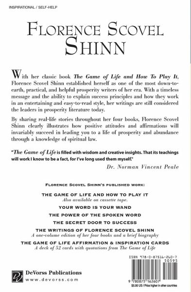 Florence Scovel Shinn had the ability to explain her success principles and how they work in an entertaining and easy-to-read style. By sharing real-life stories she illustrates how positive attitudes and affirmations invariably succeed in making one a winner in life able to control life's conditions and release abundance through a knowledge of spiritual law. Her published works include: The Game of Life and How to Play It, Your Word Is Your Wand, The Power of the Spoken Word, The Secret Door to Success, The Writings of Florence Scovel Shinn (A one-volume DeVorss edition of her four books along with a Shinn biography), The Game of Life Affirmation & Inspiration Cards 52 cards with quotations from The Game of Life.