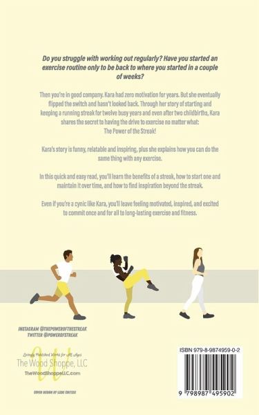 Do you struggle with working out regularly? Have you started an exercise routine only to be back to where you started in a couple of weeks? Then you're in good company. Kara had zero motivation for years. But she eventually flipped the switch and hasn't looked back. Through her story of starting and keeping a running streak for twelve busy years and even after two childbirths, Kara shares the secret to having the drive to exercise no matter what: The Power of the Streak! Kara's story is funny, relatable and inspiring, plus she explains how you can do the same thing with any exercise. In this quick and easy read, you'll first learn the benefits of a workout streak. Next, you'll learn the essentials of starting a streak, including choosing your exercise: · Running · The elliptical · Brisk Walking · Biking · Swimming/Water Aerobics · Kickboxing · A combination of these or something else! You'll learn the ins and outs of how to maintain your streak over time. Last, you'll learn about inspiration beyond the streak. Even if you're a cynic like Kara, you'll leave feeling motivated, inspired, and excited to commit once and for all to long-lasting exercise and fitness.