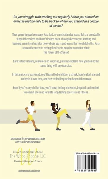 Do you struggle with working out regularly? Have you started an exercise routine only to be back to where you started in a couple of weeks? Then you're in good company. Kara had zero motivation for years. But she eventually flipped the switch and hasn't looked back. Through her story of starting and keeping a running streak for twelve busy years and even after two childbirths, Kara shares the secret to having the drive to exercise no matter what: The Power of the Streak! Kara's story is funny, relatable and inspiring, plus she explains how you can do the same thing with any exercise. In this quick and easy read, you'll first learn the benefits of a workout streak. Next, you'll learn the essentials of starting a streak, including choosing your exercise: · Running · The elliptical · Brisk Walking · Biking · Swimming/Water Aerobics · Kickboxing · A combination of these or something else! You'll learn the ins and outs of how to maintain your streak over time. Last, you'll learn about inspiration beyond the streak. Even if you're a cynic like Kara, you'll leave feeling motivated, inspired, and excited to commit once and for all to long-lasting exercise and fitness.